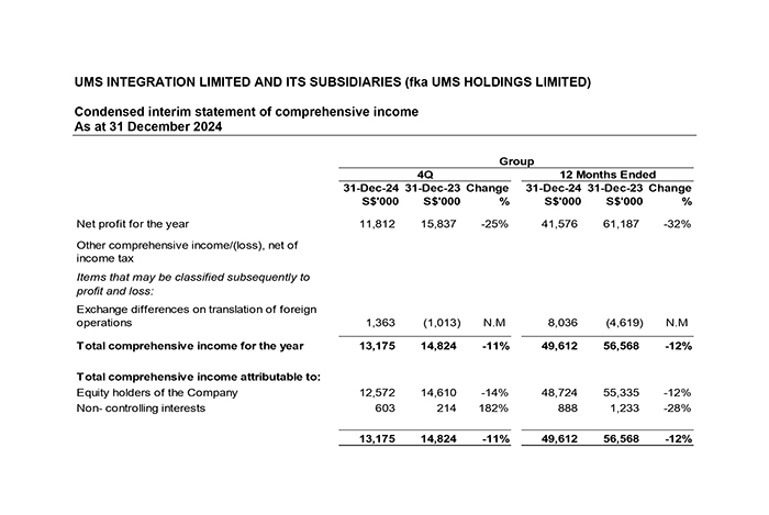 Compared to 4QFY2023, Group profit before tax fell 26% to S$12.7 million while net profit declined 25% to $11.8 million from $15.8million in 4QFY2023. Group net profit attributable to UMS shareholders decreased 29% to $11.1 million from $15.7 million in 4QFY2023.